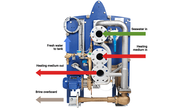 1日あたり最大60m3の造水できるAQUA Blue Cタイプは、オリジナルのAQUA Blue造水装置であり、船舶用の造水におけるリーディングソリューションです。スペースの大幅な節約に加えて、電力使用量も従来型の造水装置より50%少なくすることができます。このシステムでは供給水を、海水冷却水の流れから引き出します。