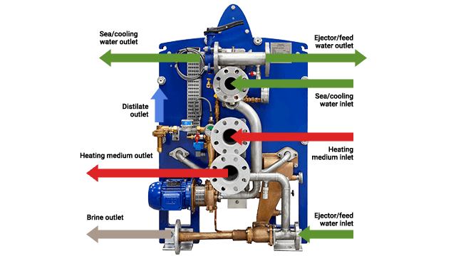 供給水はプレートパックの下部(蒸発部)に入り、ここでエンジンジャケット冷却水によって、あるいは蒸気で加熱される閉回路によって温められます。この方式によって水が75~99%の真空状態で約40~65°Cで蒸発し、ブライン/エアエジェクタによってこの状態が保たれます。(正確な温度と真空状態の範囲は、AQUA Blueのモデルごとに異なります。) AQUA Blue CタイプおよびSタイプでは、6バールまでのジャケット水圧力での高圧オプションが利用できます。