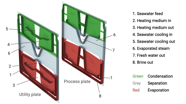 AQUA Blue造水装置は、真空蒸留の3つの機能、すなわち蒸発、分離、凝縮すべてを行う一種類のチタン製プレートで構成されます。プロセスプレートとユーティリティープレートとの違いは、ガスケット構成だけです(図を参照)。減圧プロセスは、プレートパック内部だけで行われるため、外側のシェルは必要ありません。