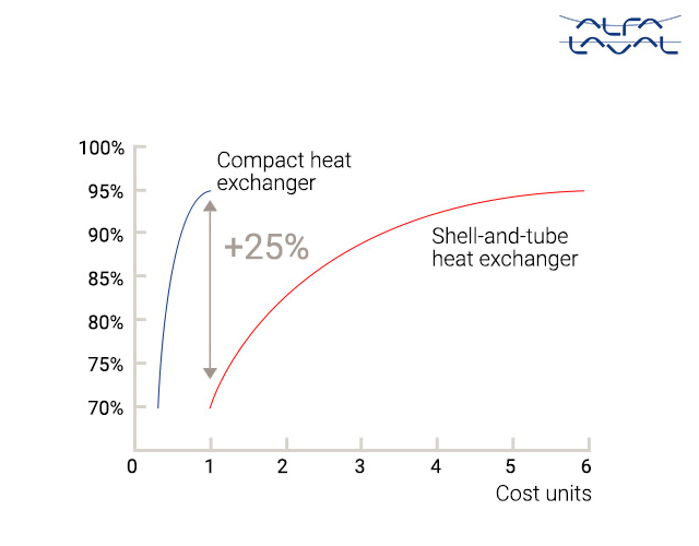 The diagram shows the heat recovery level as a function of initial cost. The yield from compact heat exchangers is up to 25% higher than for shell-and-tubes at a comparable cost. To reach the same levels of heat recovery, shell-and-tube solutions often become several times more expensive. This is due to a number of factors: