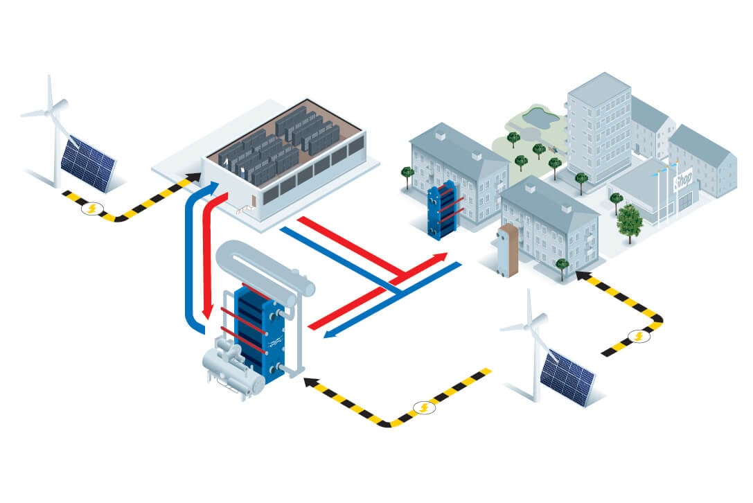 Heat is transferred from the data center’s cooling loop to an external network, such as district heating, through a heat exchanger. This method is straightforward and effective when there is consistent demand for heating nearby.
