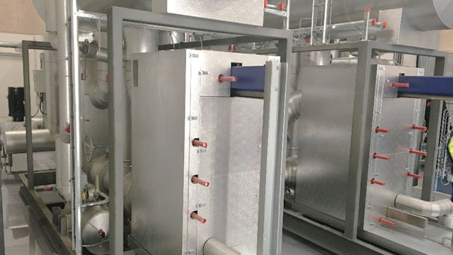 At Fuglsang Brewery malt house, Alfa Laval semi-welded PHEs in the condenser unit recover excess heat to deliver heating of hot side media from 45° to 70° C. Capacity in this case is 7.1 MW with a COP of 4.0.