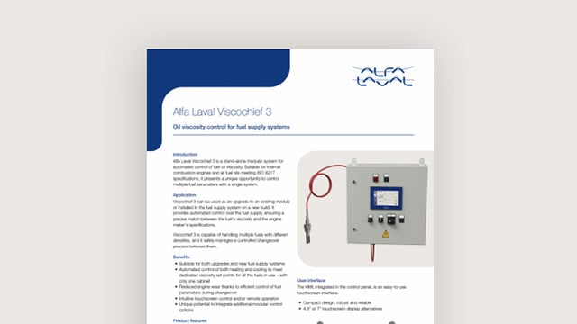 Secure correct fuel properties – despite today’s complex fuel mix – by replacing existing viscosity control with Alfa Laval Viscochief 3. Using high-end automation based on FCM Oil software, Viscochief 3 automatically handles up to four different fuels and the changeover between them, as well as the automatic cooling of distillate fuels.