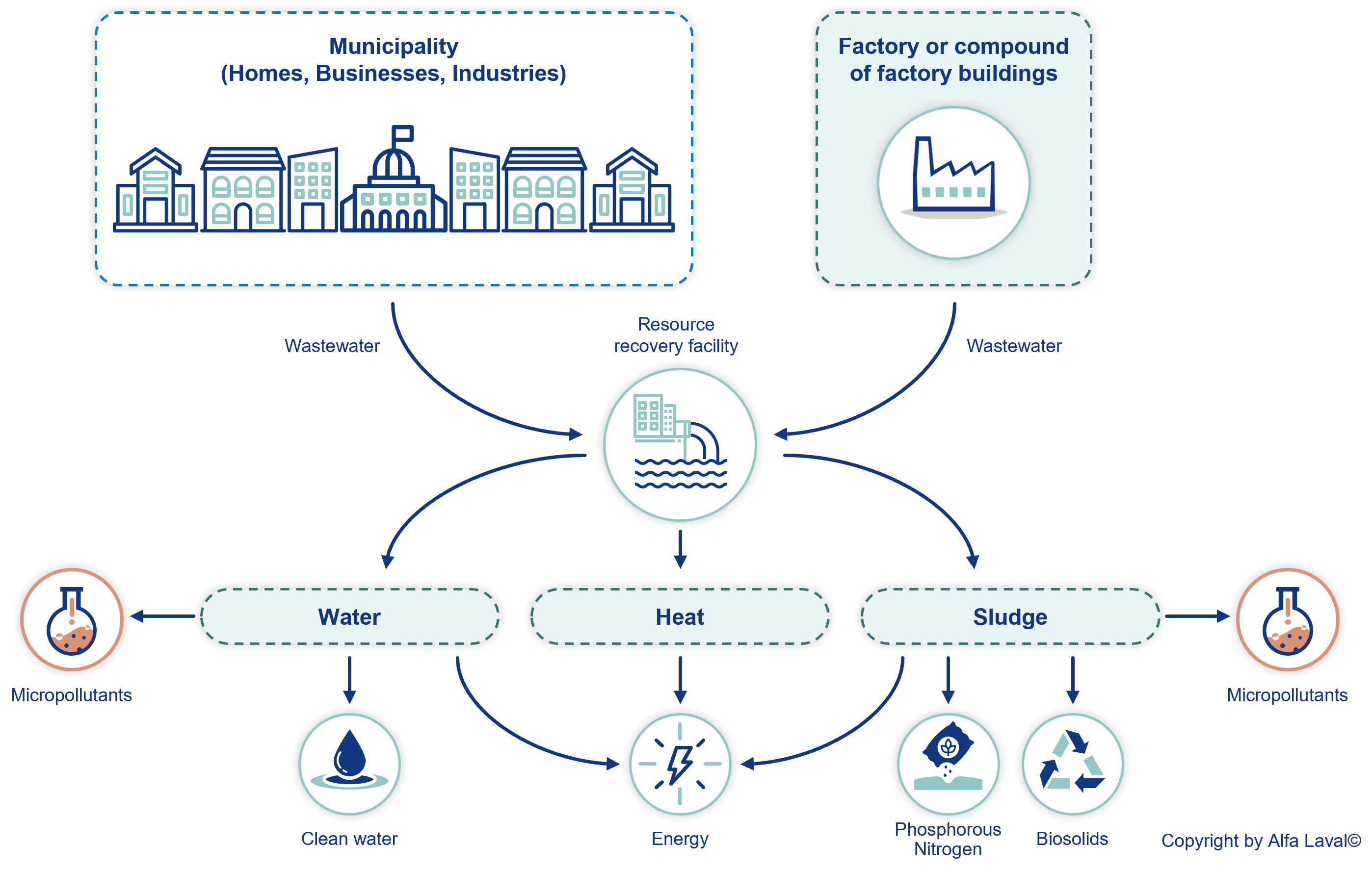 Wastewater treatment is a very energy-intensive operation, and according to the UN, the world’s municipal wastewater treatment plants use 4% of available energy. Greenhouse gases are emitted from this energy usage and from the processing itself; e.g., where methane is emitted during sludge-handling. At Alfa Laval, we know that by applying the most energy-efficient solutions, municipalities can optimize their energy consumption. There is also ample opportunity to recover heat from multiple process steps as an energy source. And methane can be recovered and used for energy generation, while the installations can also present an opportunity to incorporate hydropower.