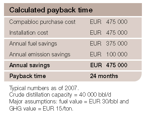 The Compablocs were brought on line in September 2006. Among the energy-saving objectives achieved was a 8–10°C increase in the furnace inlet temperature of the crude.