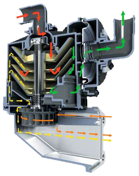 The Alfdex separator is like a dishwasher that cleans its own water. But it is anything but a household appliance. For one thing, the unit is totally sealed and never needs maintenance or service during the service life of a truck diesel engine. This is known in the business as "Fit and Forget."