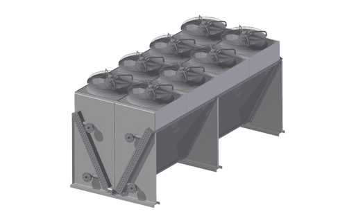 The modular, V-type cooler with sloped sections and standardized horizontal fan assemblies reduces plot space and reduces operating costs due to optimization of motor/fan power consumption. Standard VFD motor-driven fans are prewired to a control system on the unit. Optional hydraulic drives are also offered.