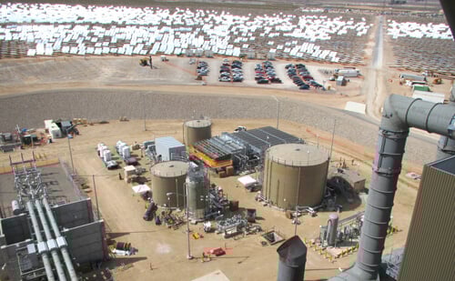 Shown here is the Alfa Laval wet/dry hybrid auxiliary cooling system installed at the Ivanpah solar electric generating system in California’s Mojave Desert. Operated by NRG Energy, the system began commercial operation in 2013 and delivers power to PG&E and Southern California Edison. The Alfa Laval hybrid system was created to maximize site water conservation while still enabling consistently low process outlet temperatures during all seasons by running dry during cooler ambient periods, then utilizing available water only during the hotter summer ambient air temperatures. An Alfa Laval Niagara wet surface air cooler (WSAC) is combined with an Alfa Laval ACE dry air cooler to maximize system efficiency while taking advantage of fluctuating ambient air temperatures.