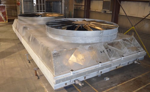 Three large two-fan Model E coolers shown in one of the assembly lines at Alfa Laval ACE's Broken Arrow, Oklahoma, facility.