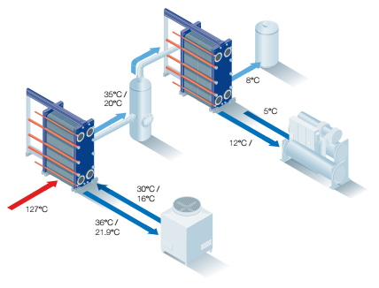 The compressed ambient humid air emitted by the Atlas Copco compressors at 6 bar is cooled from 127°C to 45°C in the first WideGap heat exchanger using cooling tower water. With the drop in temperature, the water in the air condenses and is removed with a cyclone separator. Then during the next stage of cooling another WideGap heat exchanger is used to cool the air with chilled water.