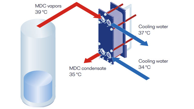 One of India’s agricultural chemical producers used shell-and-tube heat exchangers to condense MDC vapours. The customer had cooling water at 34 °C, but the MDC vapours needed to be cooled from 39.5 °C to 35 °C. The small temperature difference of just 1°C was too narrow to ensure effective condensation with their existing technology.