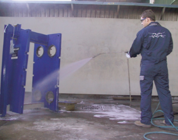 Chemical tanks that are heated and agitated provide a superior plate cleaning process compared to the water blasting and/or hand scrubbing with SS brushes in the field