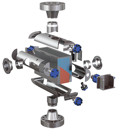 The individual plates are then stacked into a block and diffusion welded (bonded) in a state-of-the art furnace at high temperature and pressure. Multiple blocks can be welded together to create the required thermal capacity or heat transfer area. Inlet and outlet flow manifolds, customer connections and (if required) connections for drain, vent or cleaning form the welded header assemblies, which are welded onto the completed core to finalize the heat exchanger.