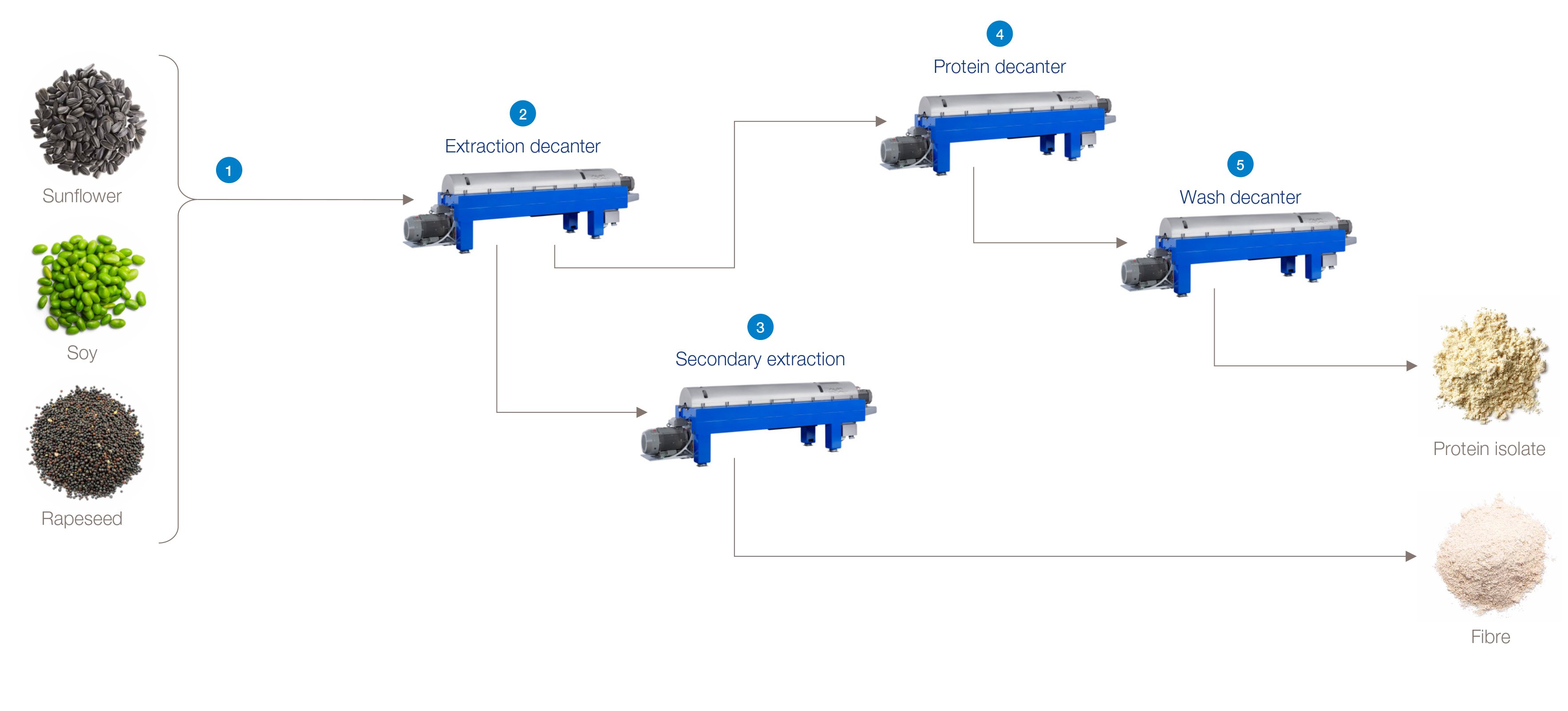 Protein extraction. Next, the slurry is processed in an extraction decanter, to separate the solubilized protein from the solids (fibre).