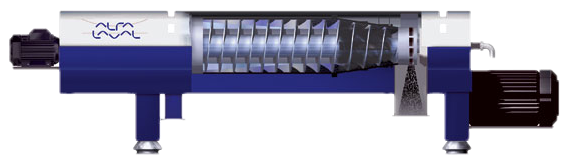 Alfa Laval Lynx Endurance decanter centrifuges are specifically designed to separate mining and mineral slurries, tailings and sludge into a solid phase and liquid phases. Separation takes place in a horizontal cylindrical bowl equipped with a scroll conveyor. The product is led into the bowl through a stationary inlet tube and is then smoothly accelerated in a full-flow feed zone design. Centrifugal forces of up to 3,500 G make the solids accumulate on the inner surface of the bowl. The conveyor rotates in the same direction as the bowl, but at a different speed. This moves the solids towards the conical end of the bowl. The solids leave the bowl through the solids discharge openings into the casing. Separation takes place throughout the length of the cylindrical part of the bowl, and the clarified liquid leaves the bowl by flowing over adjustable plate dams into the casing.