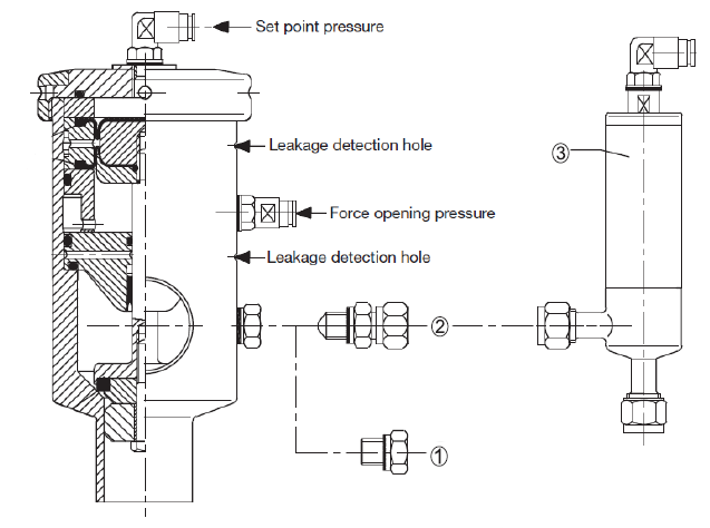 When the tank pressure exceeds the set point pressure, the valve will open and release pressure through the valve side branch for atmospheric discharge or collection. To ensure correct working conditions, there should be no backpressure after the vent port.