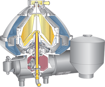 The heavier solids phase is collected at the periphery of the bowl, where it is discharged intermittently via the centrifuge cyclone. The solids are discharged by a hydraulic system below the separation space in the bowl, which forces the sliding bowl bottom to drop down at suitable intervals, thus opening the solids ports at the periphery of the bowl.